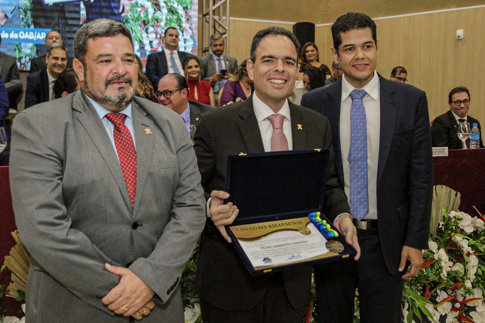 Durante a cerimônia, o Conselheiro Federal da OAB/AP e Presidente do FIDA - Fundo de Integração e Desenvolvimento Assistencial da Advocacia, Felipe Sarmento, recebeu da Assembleia Legislativa do Amapá, o Título de Cidadão Macapaense, em reconhecimento aos relevantes serviços prestados ao Estado do Amapá, através da advocacia amapaense.
